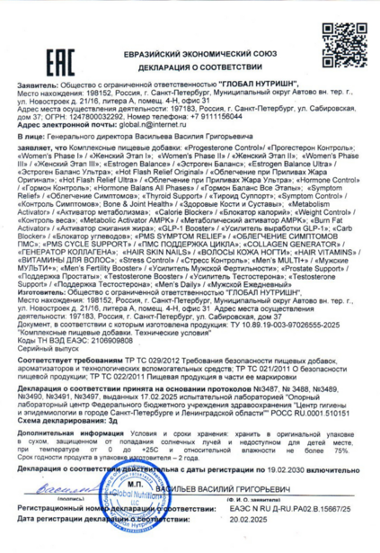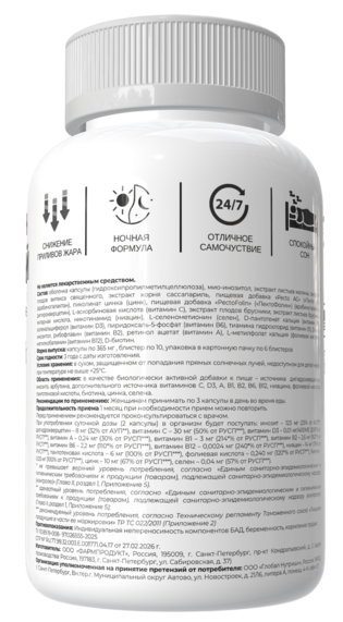 Предупреждение:  всегда читайте этикетку. Следуйте инструкциям по применению. Если симптомы не проходят, обратитесь к врачу. Витаминные добавки не должны заменять сбалансированное питание. Если у вас есть какие-либо заболевания или вы принимаете какие-либо лекарства, всегда консультируйтесь с врачом перед использованием. Храните ежедневные упаковки при температуре ниже 25°C в прохладном, сухом месте, вдали от влаги и прямых солнечных лучей.